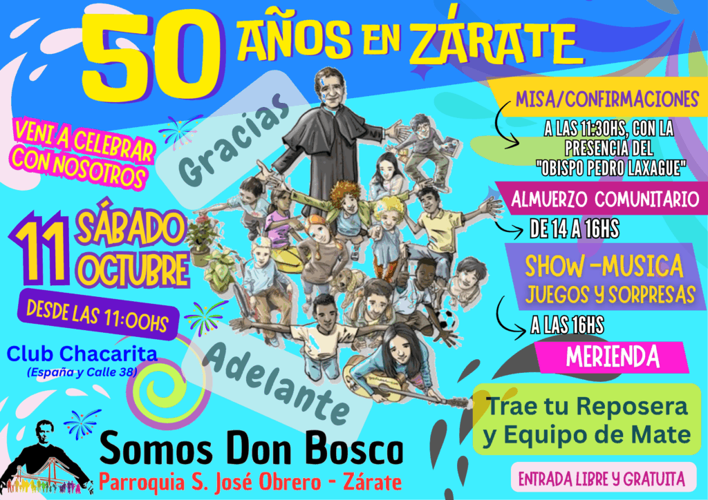 El 2025 es un año importante para nosotros porque estamos celebrando 50 Años de nuestra presencia en Zárate. Es un año para AGRADECER y también para seguir ADELANTE como expresa el slogan en que enmarcamos toda nuestra actividad presente. Por eso, queremos invitarte a la Fiesta de los 50 Años que d.m. haremos en el próximo sábado 11 de Octubre desde las 11 de la mañana en el Club Chacarita (España y Calle 38). En los carteles que mostramos encuentras toda la información. También nos atrevemos a pedirte colaboración en la difusión de este evento en tu familia y entre los tuyos. Si has tenido en estos 50 algo que ver, alguna relación con la Obra de Don Bosco (aunque ahora no estés vinculado),