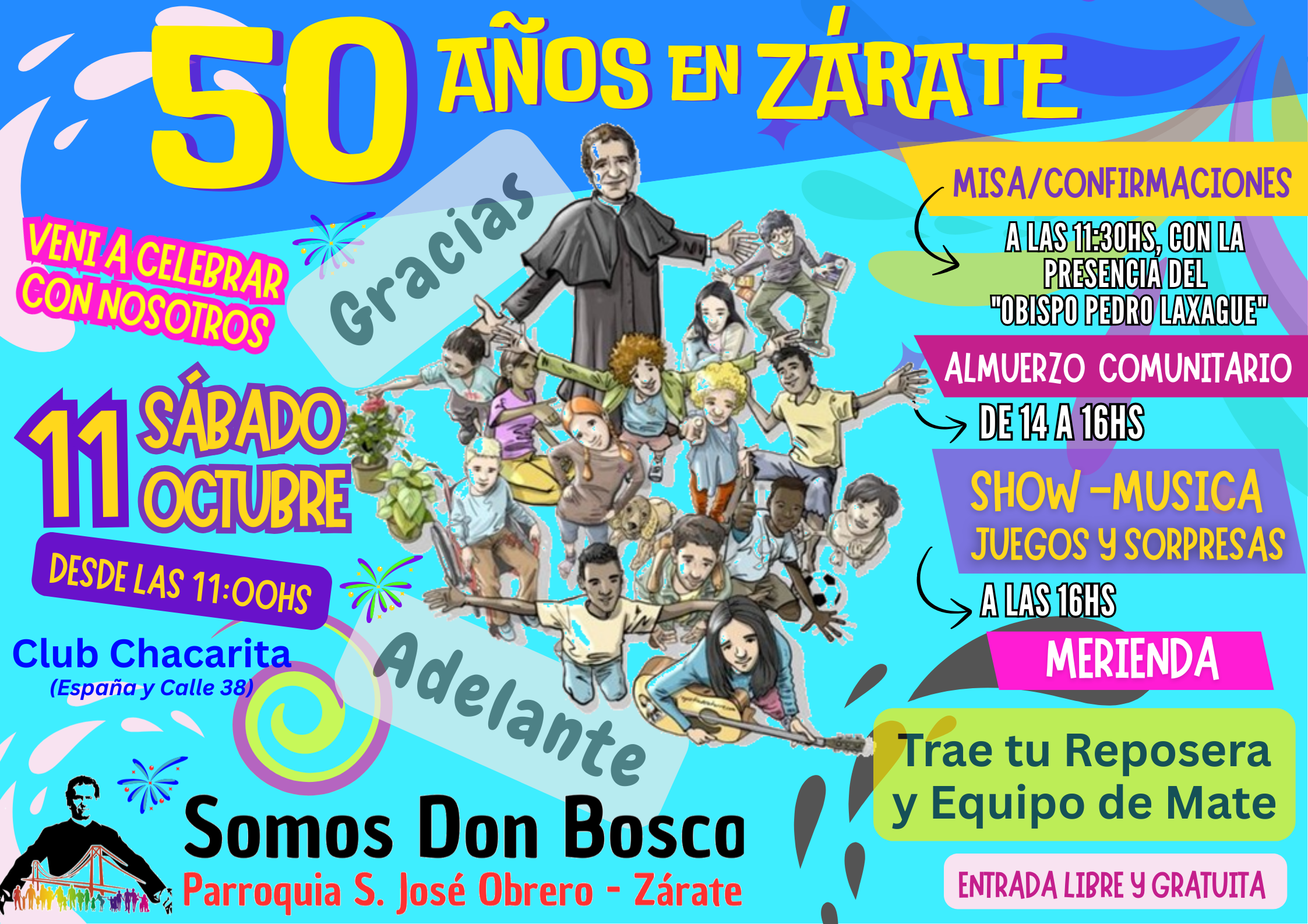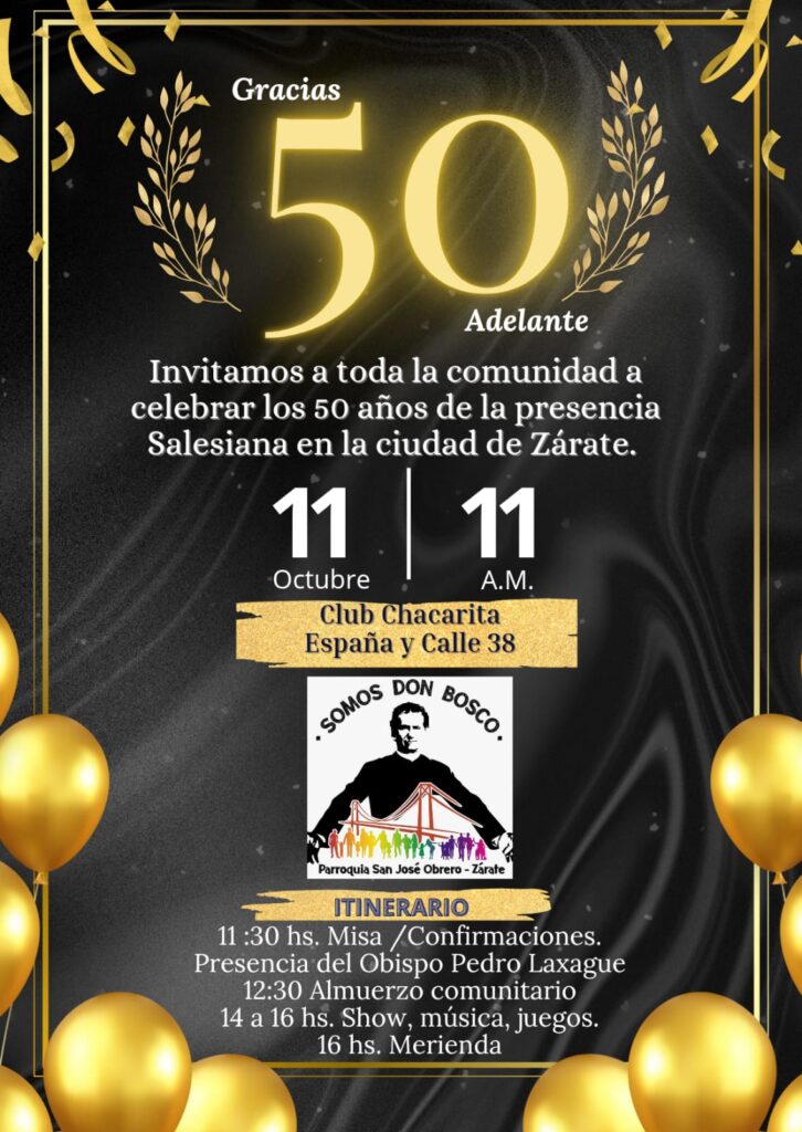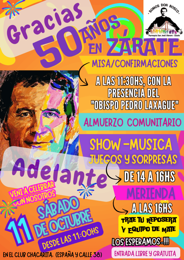 El 2025 es un año importante para nosotros porque estamos celebrando 50 Años de nuestra presencia en Zárate. Es un año para AGRADECER y también para seguir ADELANTE como expresa el slogan en que enmarcamos toda nuestra actividad presente. Por eso, queremos invitarte a la Fiesta de los 50 Años que d.m. haremos en el próximo sábado 11 de Octubre desde las 11 de la mañana en el Club Chacarita (España y Calle 38). En los carteles que mostramos encuentras toda la información. También nos atrevemos a pedirte colaboración en la difusión de este evento en tu familia y entre los tuyos. Si has tenido en estos 50 algo que ver, alguna relación con la Obra de Don Bosco (aunque ahora no estés vinculado),