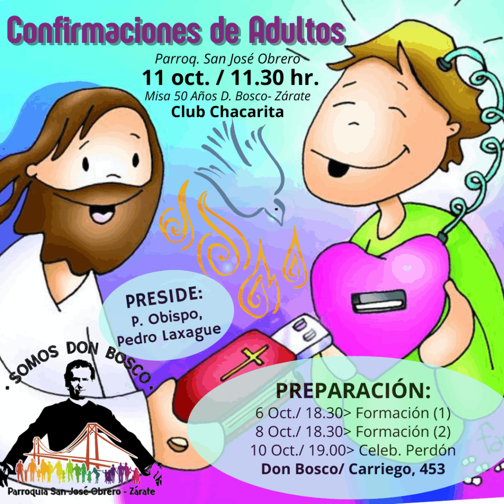 El próximo 11 de Octubre en el marco de la celebración de los 50 años de la Presencia de los Salesianos en nuestra ciudad también se celebrarán las Confirmaciones en la Parroquia. En la Eucaristía presidida por nuestro Obispo Pedro Laxagüe será la Confirmación de la fe de adolescentes y jóvenes que se vienen preparando este tiempo y también se podrán Confirmar adultos que todavía no pudieron hacerlo y así lo desean.