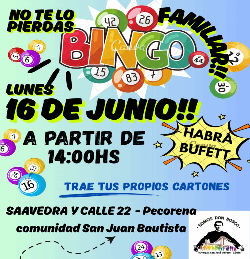 Este mes también una de nuestras Comunidades tiene un Bingo Familiar programado. El feriado lunes 16 de junio a partir de las 14 hr. en la Comunidad S. Juan Bautista en el Bº Pecorena (Saavedra y Calle 22) se realizará un Bingo para recaudad fondos para los gastos de las actividades de la Capilla: Oratorio, Catequesis, Olla popular, etc.