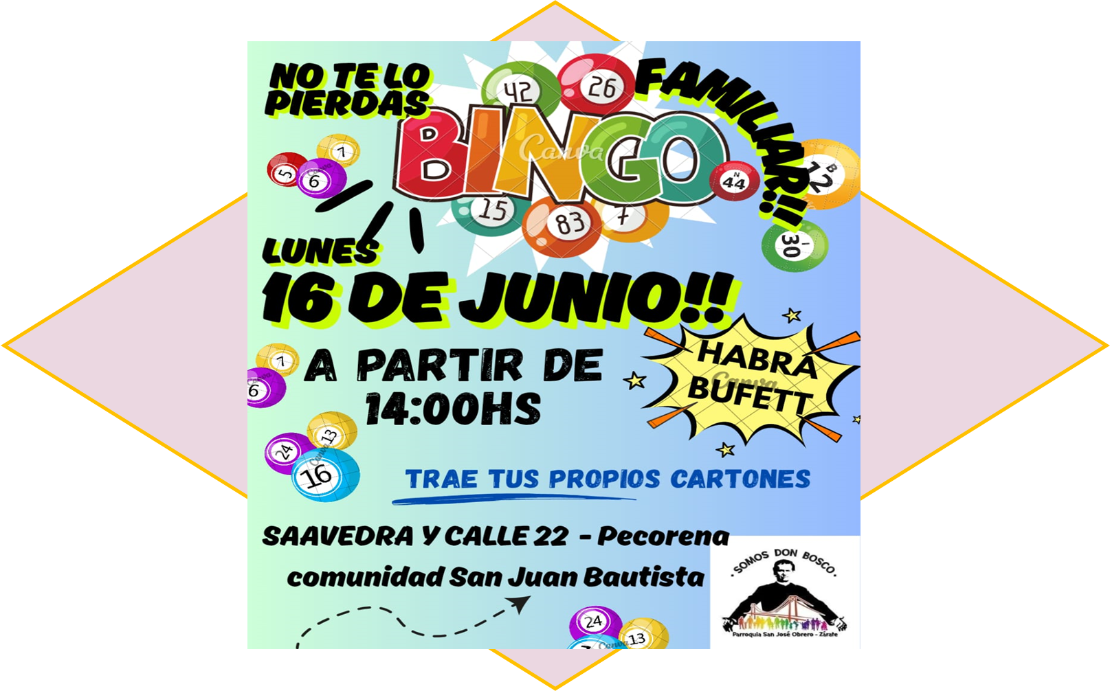 Este mes también una de nuestras Comunidades tiene un Bingo Familiar programado. El feriado lunes 16 de junio a partir de las 14 hr. en la Comunidad S. Juan Bautista en el Bº Pecorena (Saavedra y Calle 22) se realizará un Bingo para recaudad fondos para los gastos de las actividades de la Capilla: Oratorio, Catequesis, Olla popular, etc.