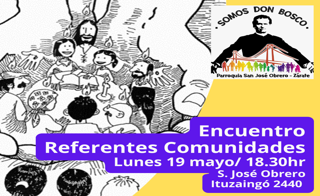 Al próximo lunes 19 de mayo a las 18.30 hr en San José Obrero (Ituzaingó, 2440) nos juntamos los Referentes de las Comunidades de nuestra parroquia y Obra Don Bosco en Zárate.
