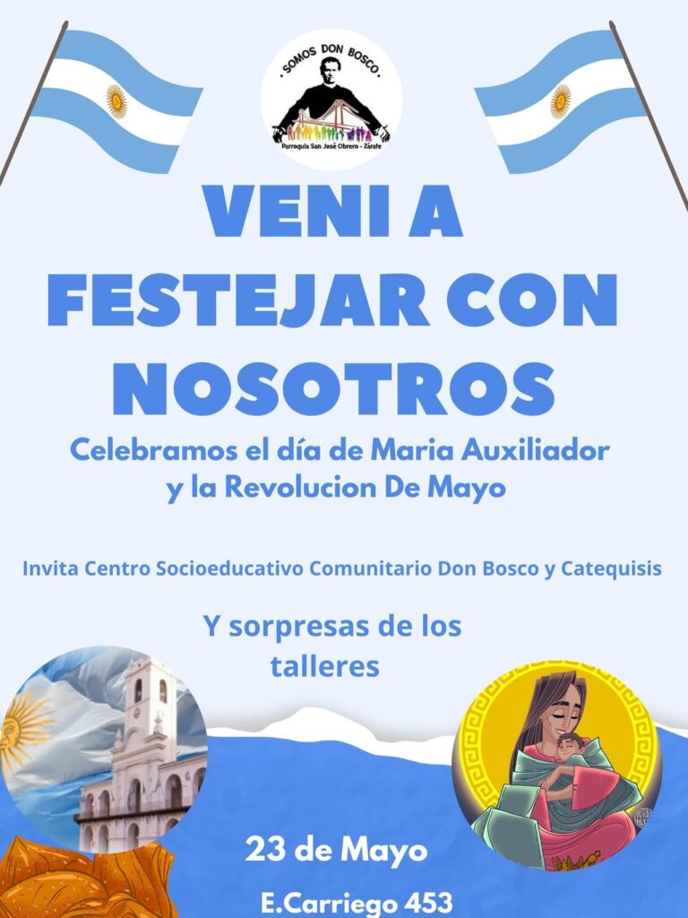 El próximo viernes, 23 de Mayo en el CSC Don Bosco de E. Carriego 453 celebramos la Fiesta de María Auxiliadora y la Revolución de Mayo: VENÍ A FESTEJAR CON NOSOTROS!!