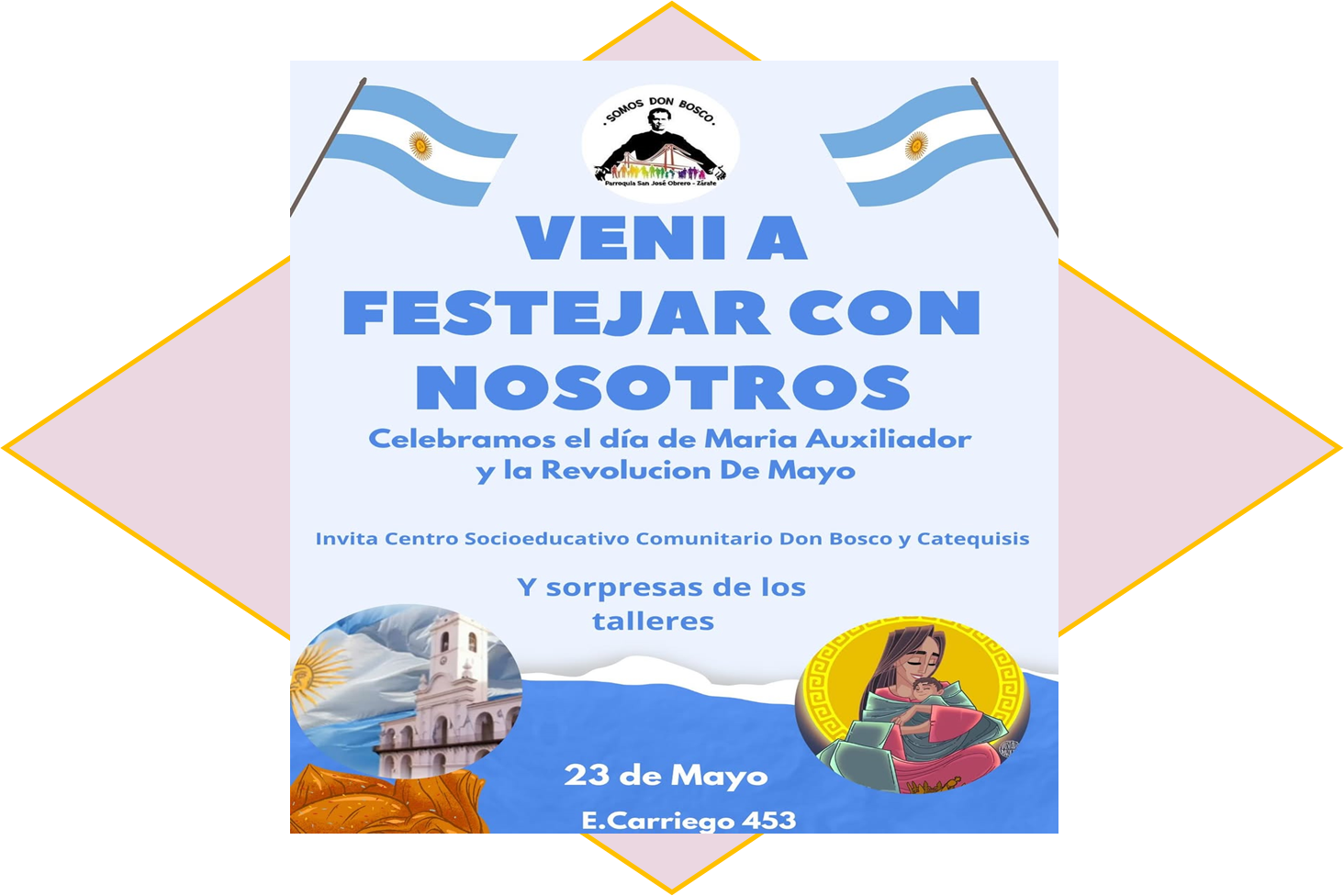 Esta propuesta surge de la Comunidad Don Bosco, en concreto del Socioeducativo y los grupos de Catequesis de Primera Comunión y tiene como objetivo festejar con todas las familias implicadas el Día Patrio del 25 de Mayo y la Fiesta de María Auxiliadora (24 mayo). Es una invitación a toda la comunidad vecinal para la tarde del viernes, a partir de las 18 hr.