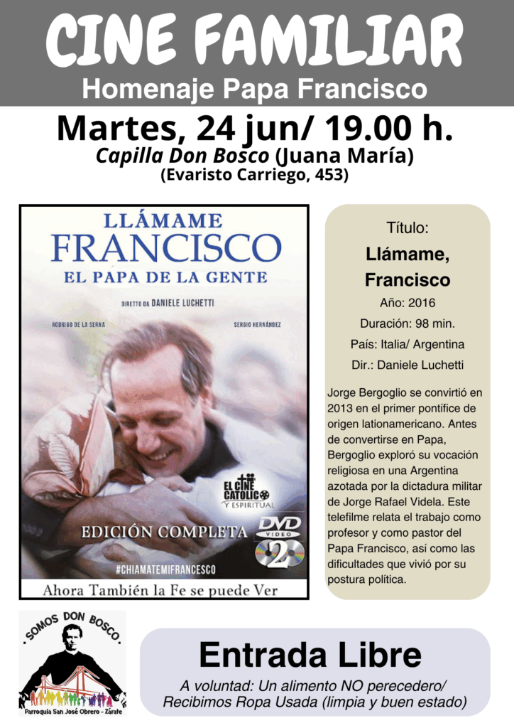 El martes 24 de junio pasaremos la película «LLÁMAME FRANCISCO» en la Capilla Don Bosco (E. Carriego, 453) a las 19.00 hr. Entrada libre para todo el que quiera. NO TE LO PUEDES PERDER!!