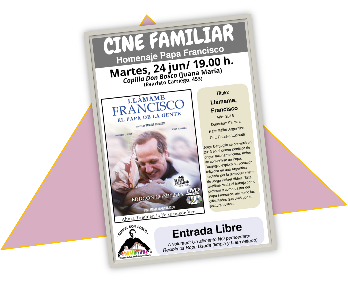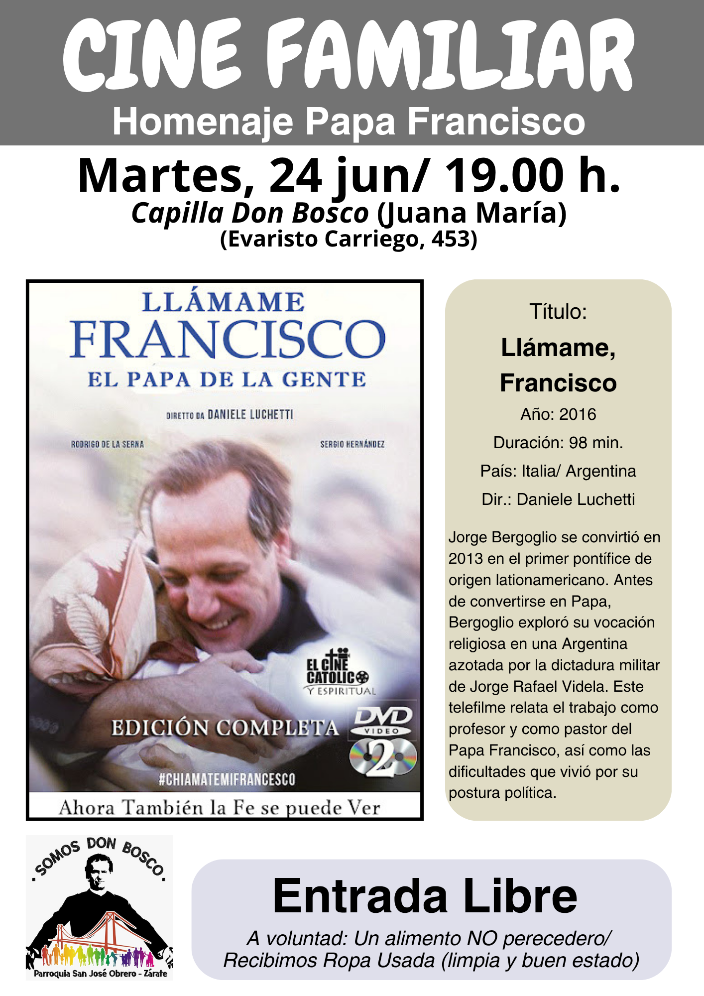 El martes 24 de junio pasaremos la película «LLÁMAME FRANCISCO» en la Capilla Don Bosco (E. Carriego, 453) a las 19.00 hr. Entrada libre para todo el que quiera. NO TE LO PUEDES PERDER!!
