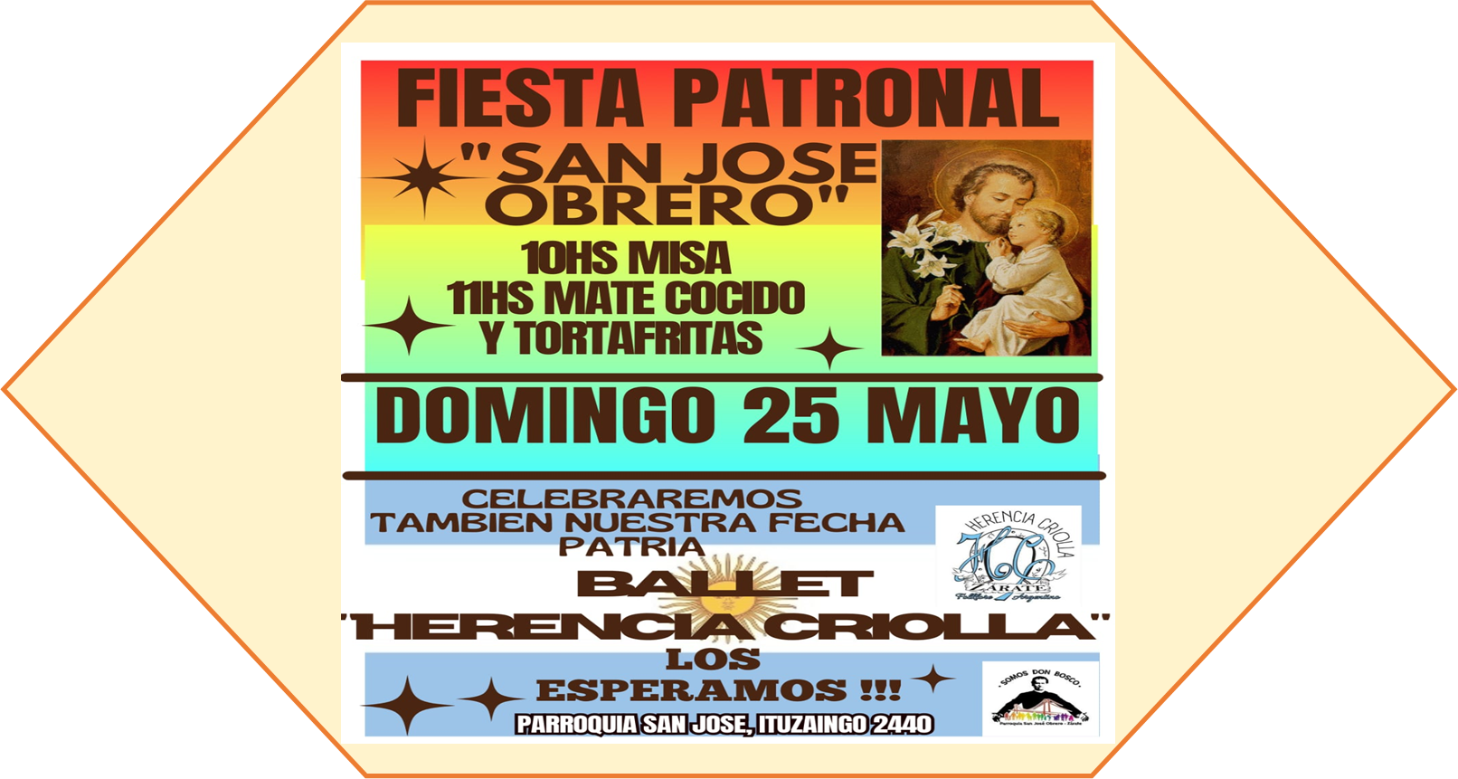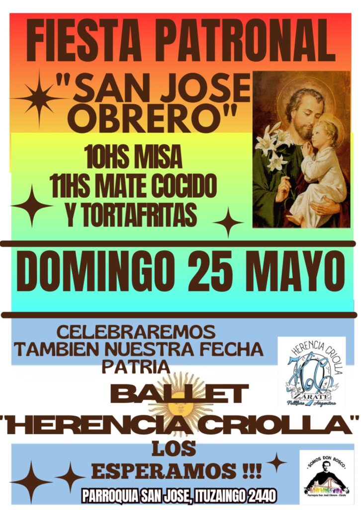 El domingo 25 de Mayo, Día Patrio, nosotros clbraremos también al Patrono de nuestra Parroquia, SAN JOSÉ OBRERO. Como todos los domingos a las 10.00 se celebrará la Misa en el templo de la Plaza S. Jacinto (Ituzaingó, 2440) y posteriormente se compartirá Mate cocido con tortafritas para todos los presentes, amenizados por el Ballet «HERENCIA CRIOLLA».