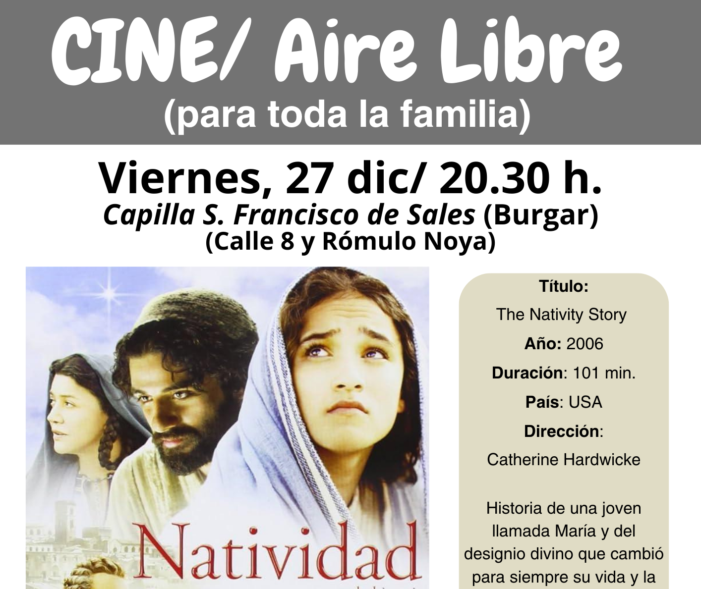 El próximo viernes, 27 de diciembre, arrancamos con una nueva actividad para este tiempo y para toda la familia. A las 20.30 hr. les invitamos a visionar en Pantalla Gigante y al Aire Libre, como en los Cinema-Autos de antaño una película que retrata el nacimiento de Jesús, Dios con nosotros, en nuestra historia. Esta obra se realizó en USA en 2.006 dirigida por Catherine Hardwicke y tiene una duracción de 101 min.
