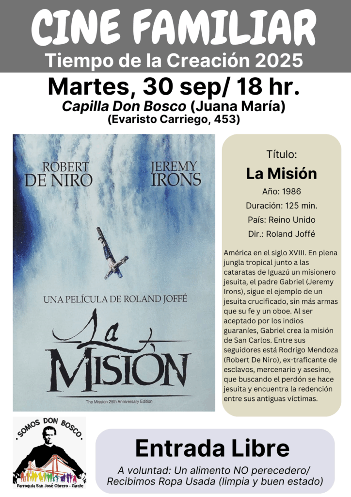 El próximo martes 30 septiembre a las 18 hr. en la Capilla Don Bosco de E. Carriego 453 en nuestra sección de Cine para toda la familia pasaremos una película que fue todo un clásico del cine y quienes somos un poco mayores recordamos de nuestra infancia y juventud: LA MISIÓN (Reino Unido, 1986) con Rober de Niro y Jeremy Irons.