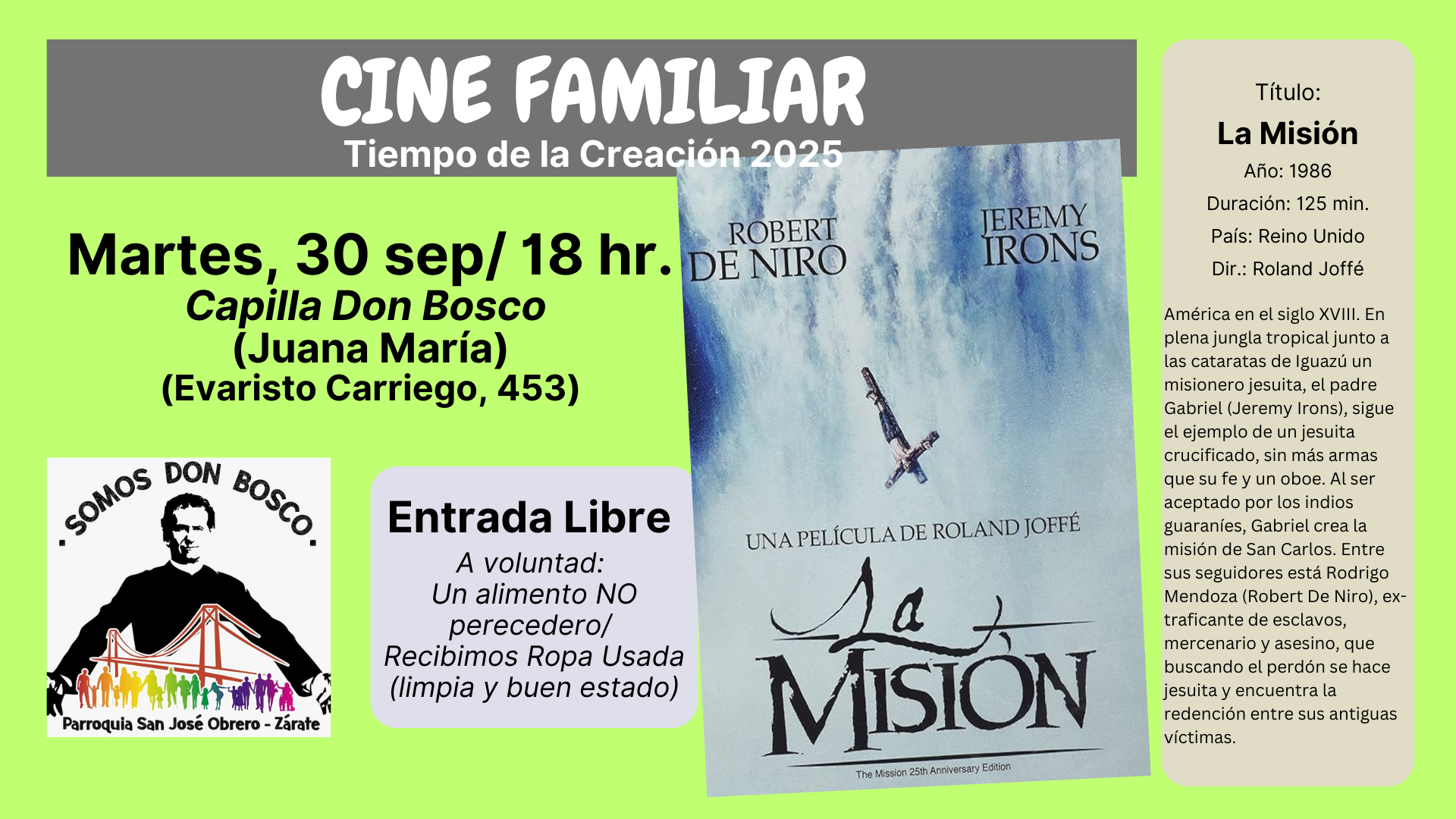 El próximo martes 30 septiembre a las 18 hr. en la Capilla Don Bosco de E. Carriego 453 en nuestra sección de Cine para toda la familia pasaremos una película que fue todo un clásico del cine y quienes somos un poco mayores recordamos de nuestra infancia y juventud: LA MISIÓN (Reino Unido, 1986) con Rober de Niro y Jeremy Irons.