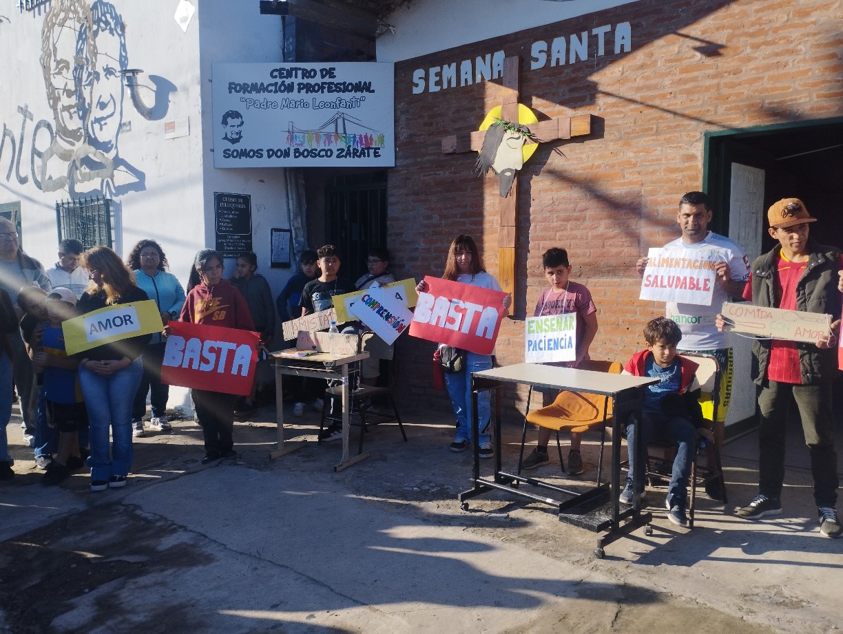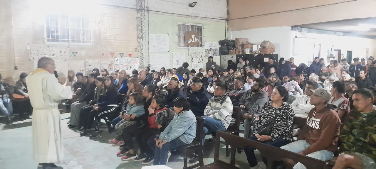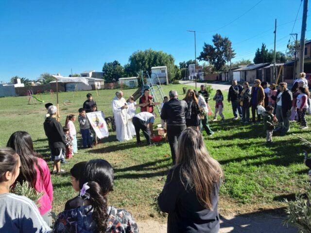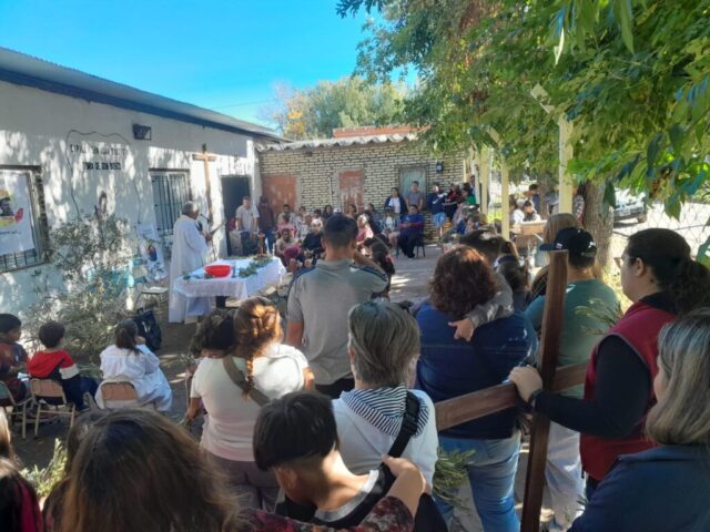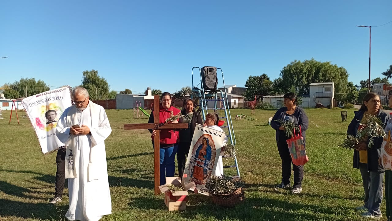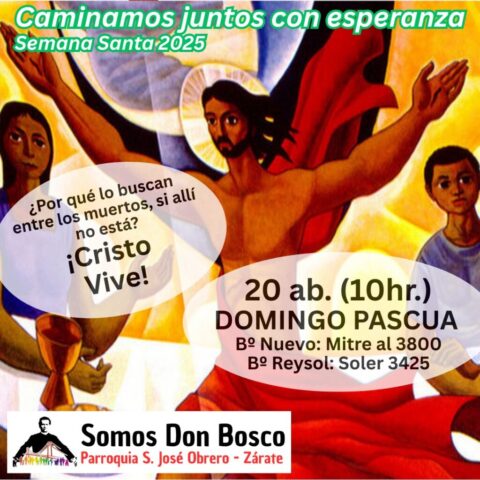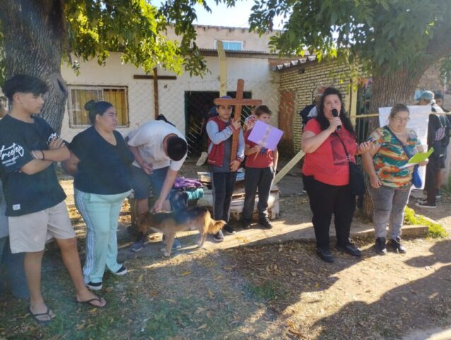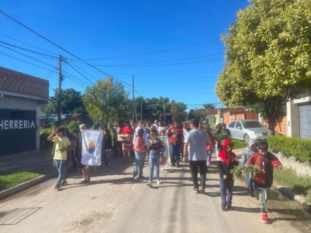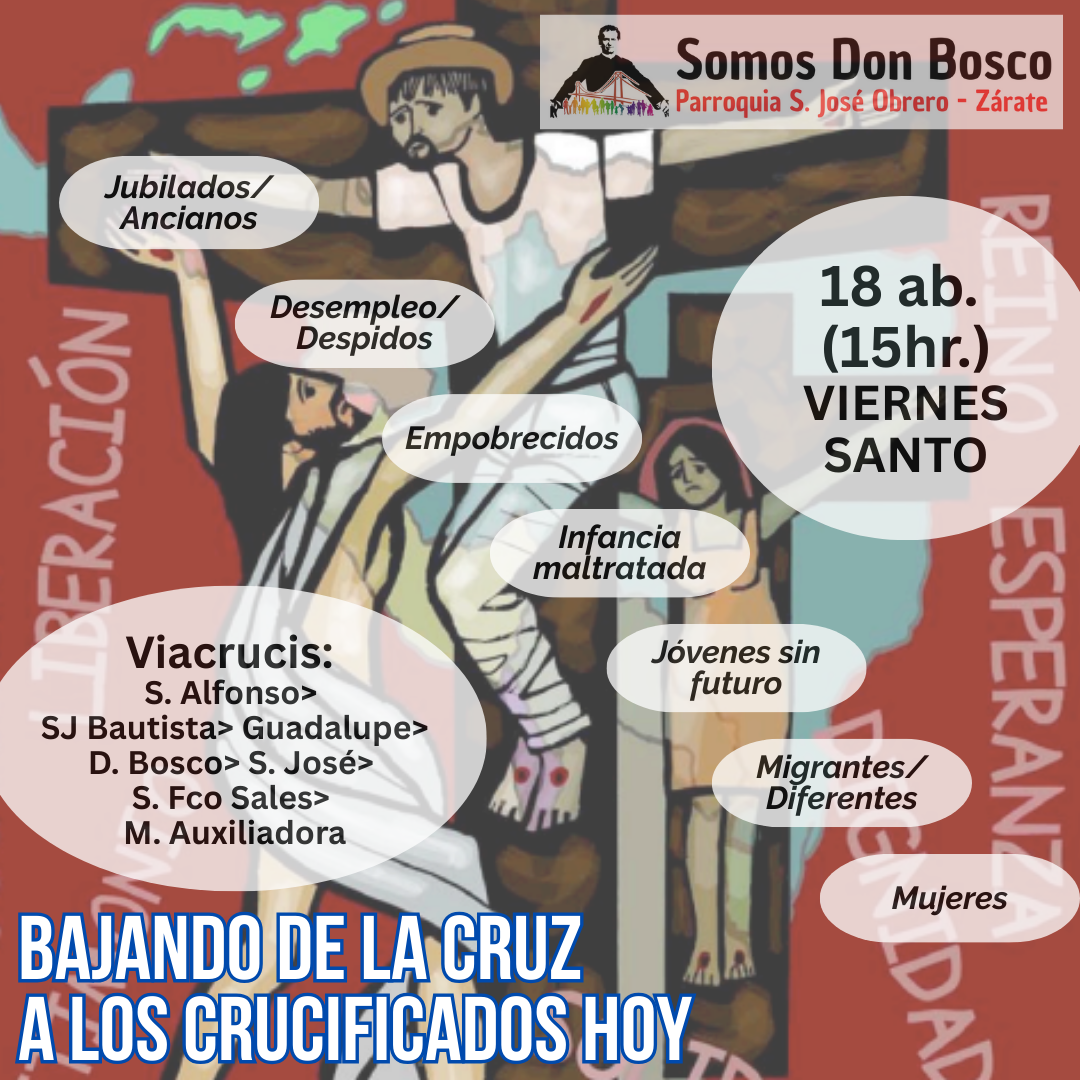 El viernes santo caminamos con Jesús con la cruz, acercándonos a algunas realidades de cruces que vivimos en este tiempo. Fuimos recorriendo las distintas capillas y comunidades acercándonos en cada lugar a una de estas Cruces: S. Alfonso> Jubilados, S. Juan Bautista> Despedidos y Desempleados, Guadalupe> Empobrecidos, Don Bosco> Infancia Maltratada, S. José> Jóvenes sin Futuro, S. Fco. Sales> Migrantes y Diferentes, María Auxiliadora> Mujeres. Nos comprometimos como comunidad a seguir bajando de la Cruz a nuestros hermanos y hermanas oprimidos por un sistema injusto e inhumano y así caminar a la Pascua de Jesús y nuestra pascua.