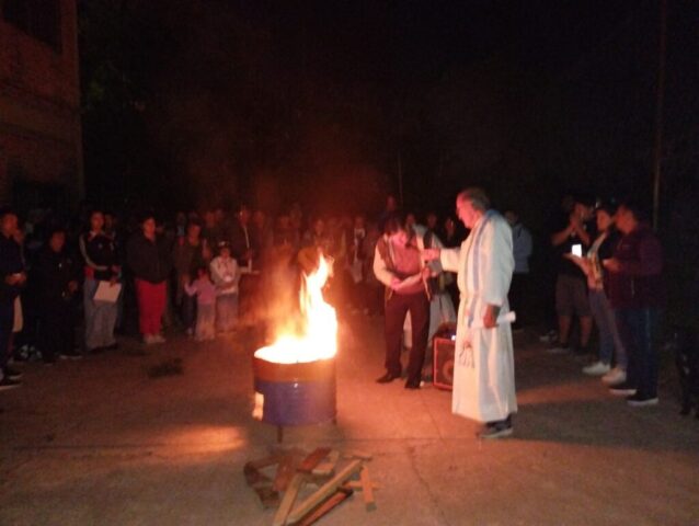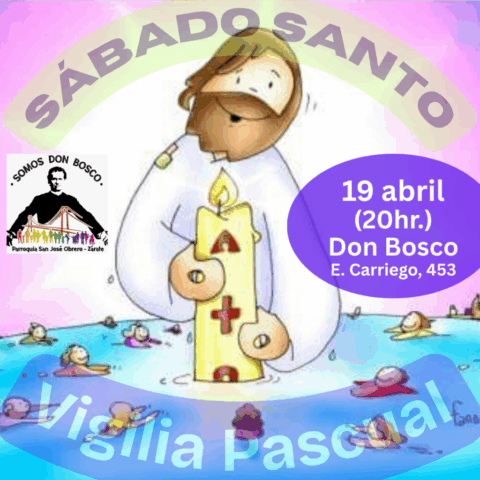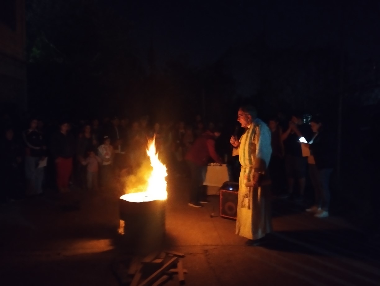 Llegamos así al sábado en silencio y esperando la noche para vivir y celebrar la Resurrección de Jesús. Comenzamos a las 20 hr. en el SUM Don Bosco o más bien en el exterior y en plena oscuridad con el Rito del Fuego y el canto del Pregón pascual: PORQUE LO BUSCAN ENTRE LOS MUERTOS, SI ALLÍ NO ESTÁ. CRISTO ESTÁ VIVO, RESUCITADO, ALELUYA, ALELUYA!!