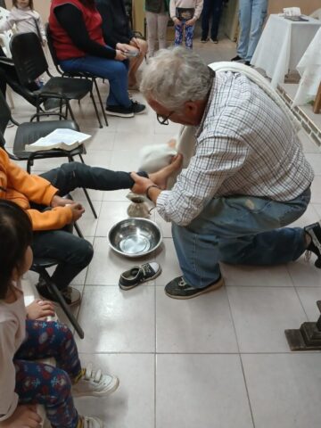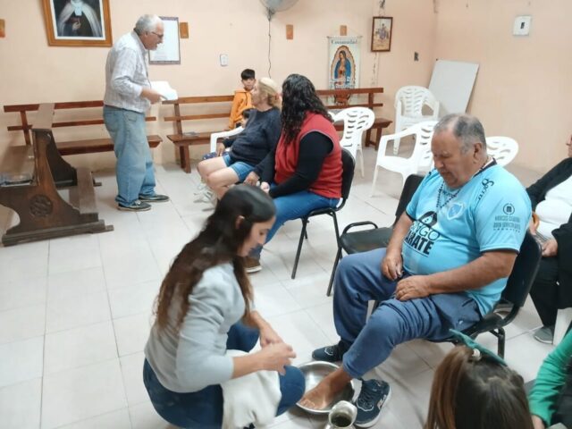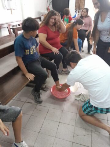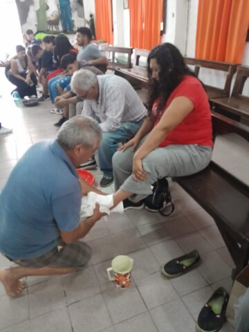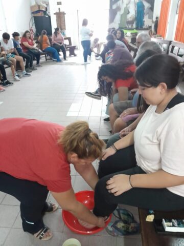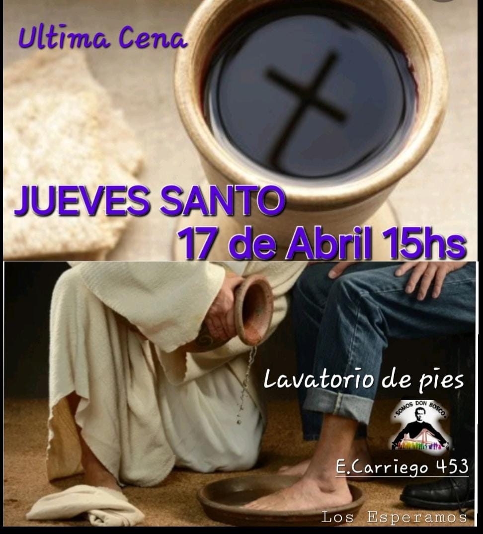 En el jueves se celebra el día de la Cena del Señor (Eucaristía, Misa) y también la institución del ministerio ordenado para el servicio de la Comunidad, así como también el día del Amor Fraterno, pues es el fruto principal de la Eucaristía. Tradicionalmente en nuestra parroquia se celebra el lavatorio de los pies en las distintas capillas y luego nos juntamos todos para la celebración de la Cena del Señor en S. José Obrero, sede principal. Este año, atentos a la realidad que vivimos quisimos destacar el servicio a las personas mayores, jubilados y ancianos que sufren especialmente las medidas económicas de este gobierno.