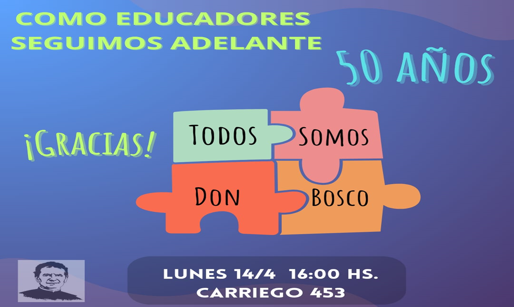 El próximo lunes, 14 abril a las 16 hr. en el SUM Don Bosco de Carriego 453 tendremos el tercer Encuentro de Educadores de nuestra Presencia Salesiana. En esta oportunidad lo hacemos en el marco de la celebración de nuestro 50 aniversario.