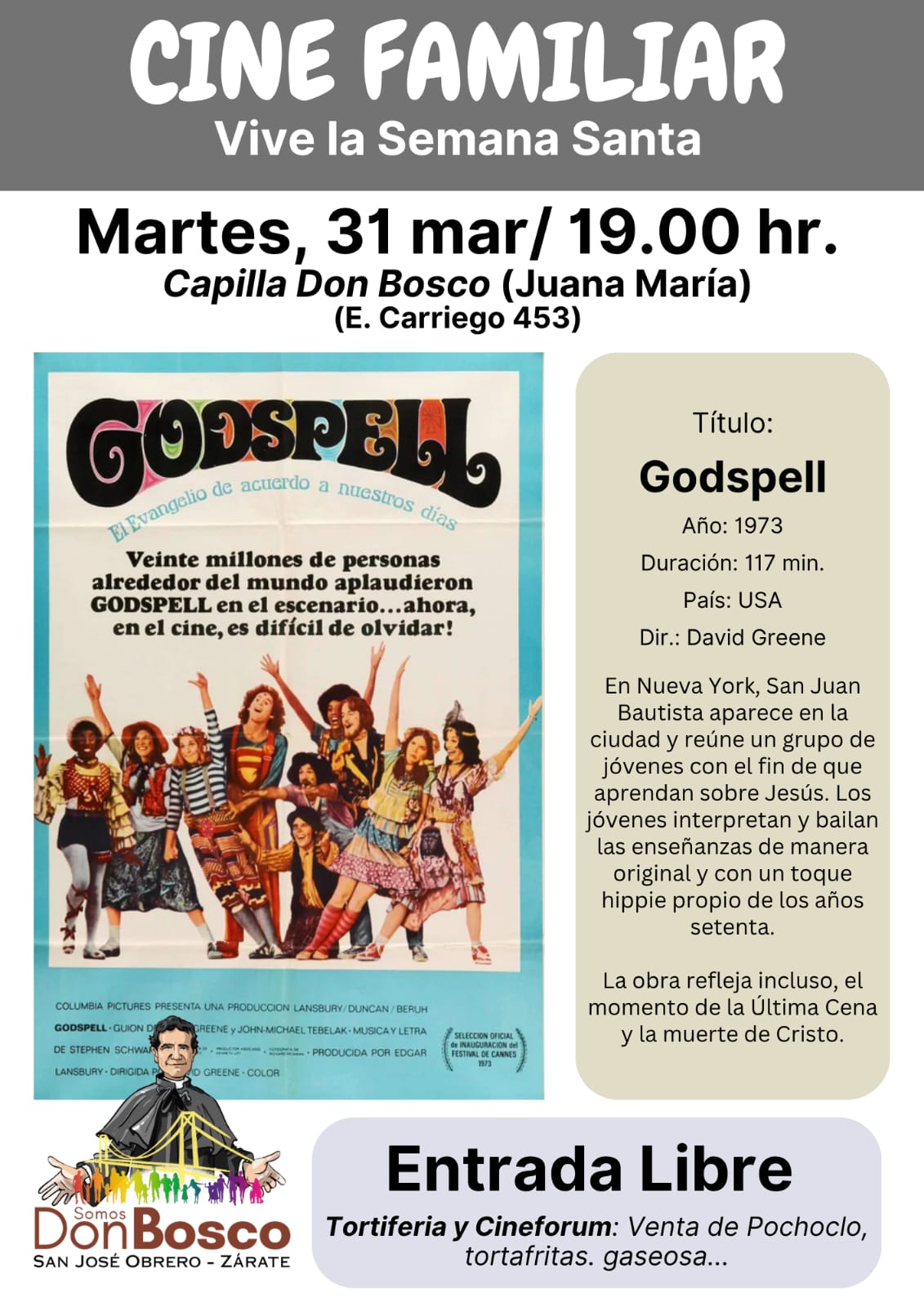 También en esta fecha nos juntamos para ver en Cine la película del Musical Godspell que se estrenó en 1973 después del éxito que tuvo la obra teatral en New York (Broadway). Se trata de un film que nos muestra un Jesús cercano y humano que acompaña al grupo de los llamados/as con sus enseñanzas y parábolas con un lenguaje muy actualizado.
